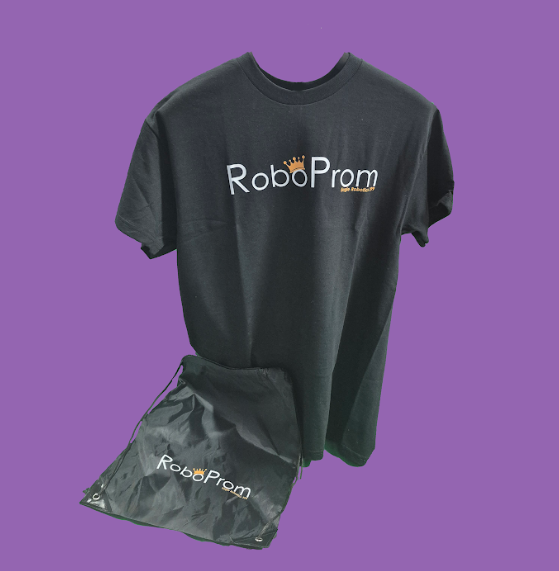 Swag Packs will be available for presale along with tickets for $12 USD. Additional swag will also be sold at RoboProm during the event (limited quantities: $15 USD for shirt and $5 USD for drawstring bag).