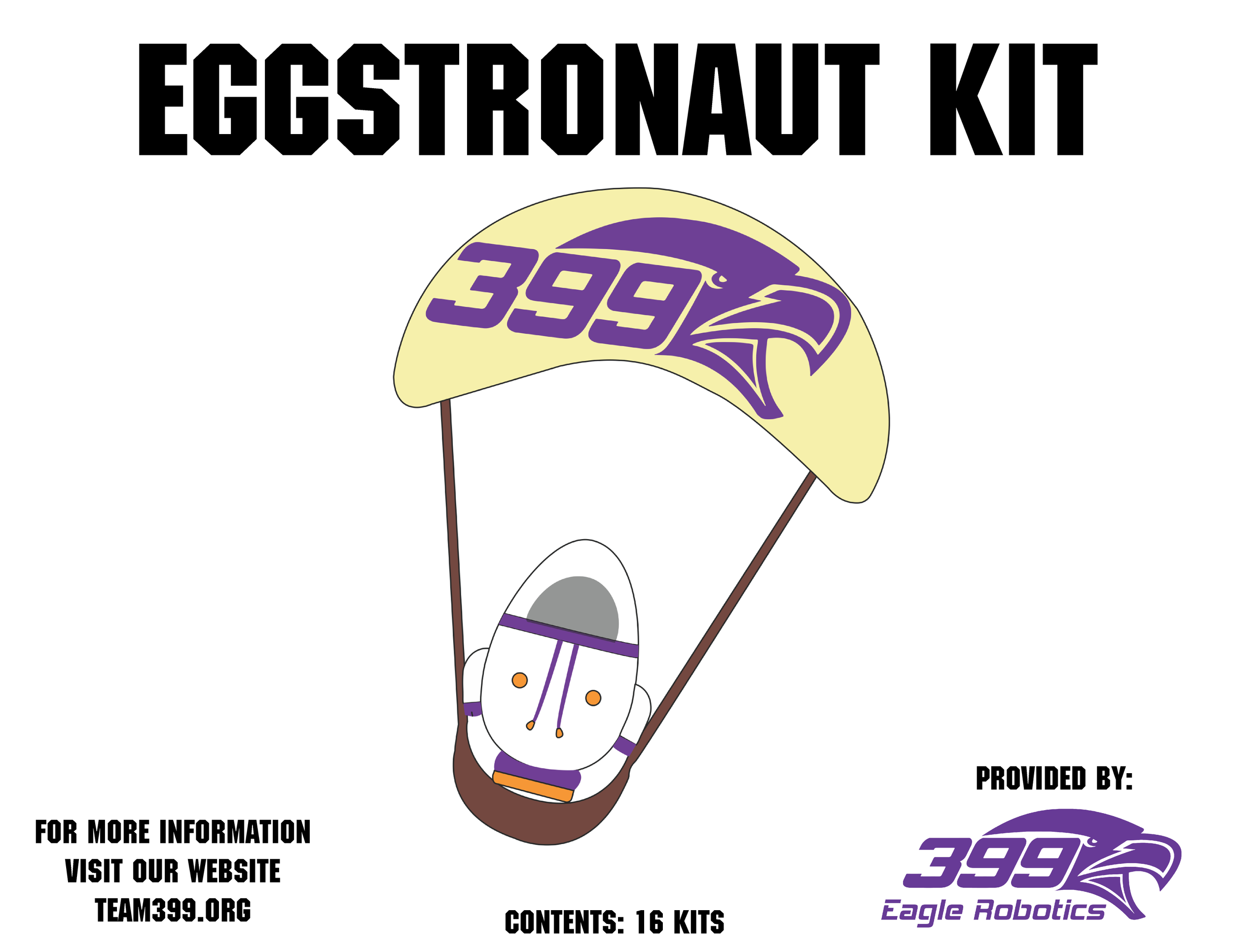 Team 399’s Eggstronaut Kits are a free, hands-on STEM activity that lets students design and build parachutes to protect an egg from cracking when dropped. Each kit contains all materials and a master copy of instructions—eggs are the only item you need to supply—and is designed for pairs (one box supports 16 kits, ideal for 32 students). The activity encourages creativity, problem-solving, and teamwork! You can find the PDF of the complete packet in the button below.